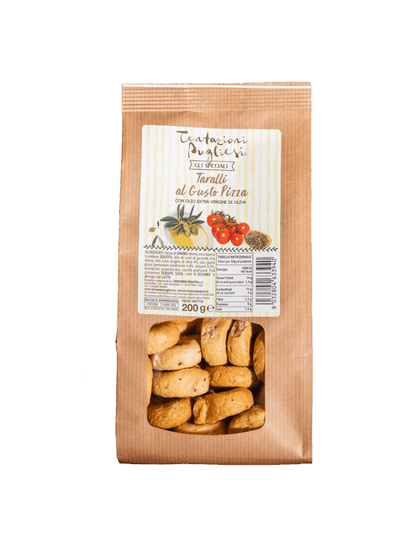 Taralli al Gusto Pizza to małe, chrupiące krążki z południa Włoch, o smaku włoskiej pizzy, a więc z dodatkiem oregano, pomidorów, rozmarynu i papryki.